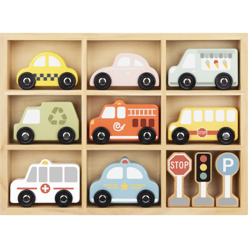 Tooky Toy Koka transportlīdzekļu un ceļa zīmju komplekts kastē