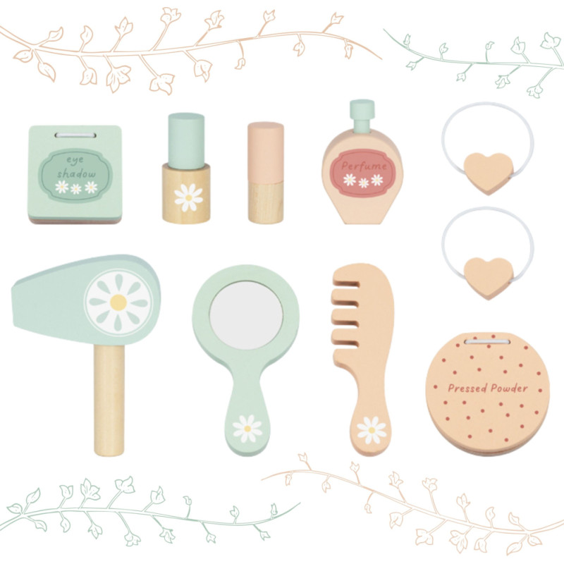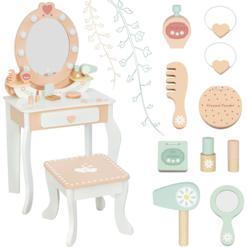 Tooky Toy Drewniana Toaletka z Krzesełkiem Akcesoria Lustro z Oświetleniem LED + Kosmetyki