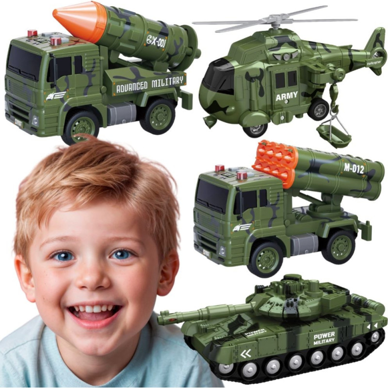 Woopie Zestaw Pojazdów Wojskowych z Wyrzutnią Czołg Helikopter 4SZT Skala 1:20